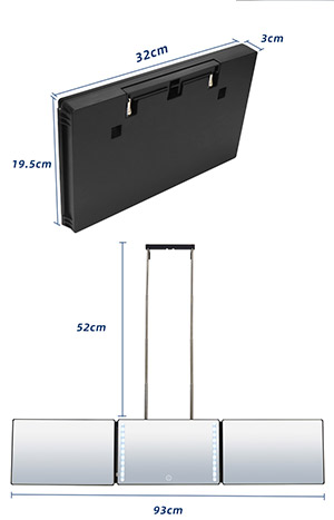 Le miroir triptyque utilise des matériaux ABS et verre de haute qualité, avec un angle de vision de 360 degrés, qui permet de voir facilement tous les angles de la tête et du visage. Le miroir est un assistant puissant pour un maquillage parfait, une coiffure soignée. La lumière LED peut être allumée et éteinte avec une simple touche. La lumière froide reflète la vraie couleur. La lumière est naturellement douce, lumineuse mais pas éblouissante, de sorte que vous puissiez toujours avoir un effet visuel parfait dans les endroits sombres ou mal éclairés. Le miroir lumineux a un crochet réglable en hauteur, qui peut être accroché à la porte ou au mur ou placé sur la table côte à côte. Il n'y a pas besoin de s'inquiéter de changer la batterie, et elle peut être utilisée pendant une semaine après deux heures de charge à chaque fois. Le miroir 360° est pliable, vous pouvez facilement le mettre dans votre sac à dos et vos bagages.
