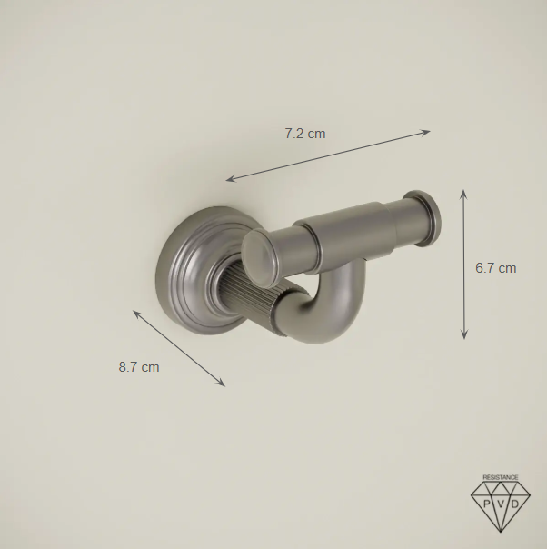 Avec sa finition gun métal moderne et son motif cannelé guilloché, la patère murale César apporte caractère et élégance à la salle de bain. Inspirée du design de la robinetterie César, elle crée une harmonie esthétique parfaite avec les autres éléments de la collection.
